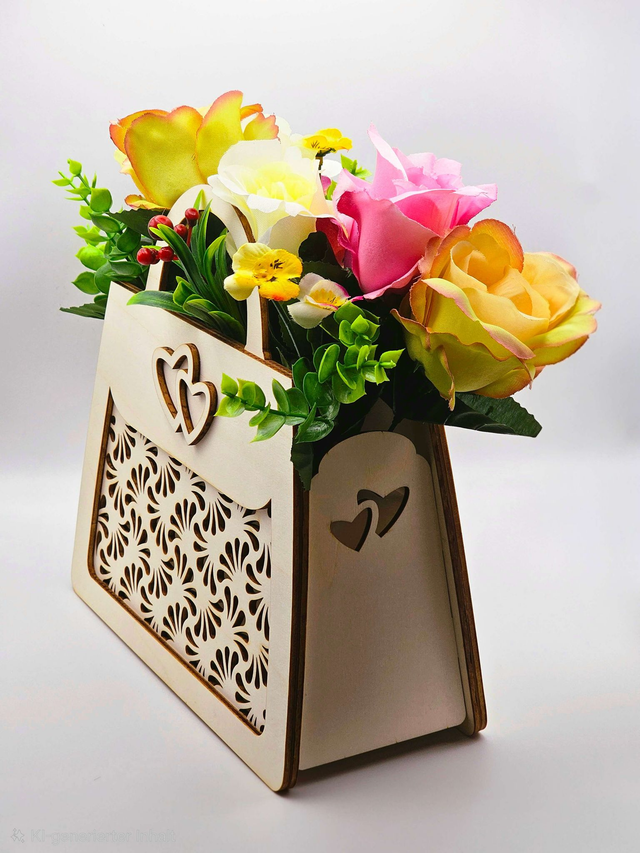 Elegante Blumentasche aus Holz mit dekorativem Laser-Muster und Herzdetails. Perfekt als originelle Verpackung für Blumen, als Dekoration oder als besonderes Geschenk für viele Anlässe wie Geburtstag, Muttertag oder Frühling.