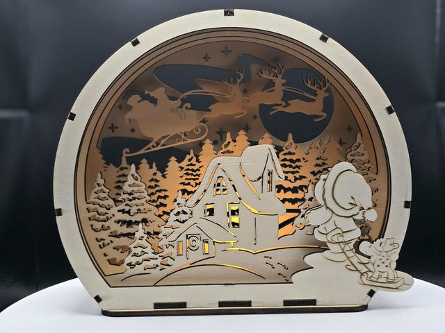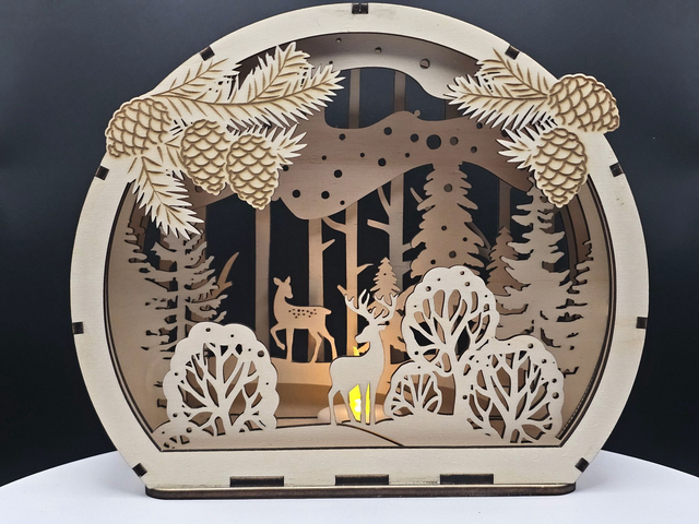 Diese liebevoll gestaltete Winterlandschaft aus hochwertigem Holz bringt eine wunderschöne, warme Atmosphäre in jedes Zuhause. Die filigranen Details – Rehe, Bäume, Schneelandschaft und Tannenzapfen – wurden präzise mit dem Laser geschnitten und ergeben eine beeindruckende 3D-Optik.