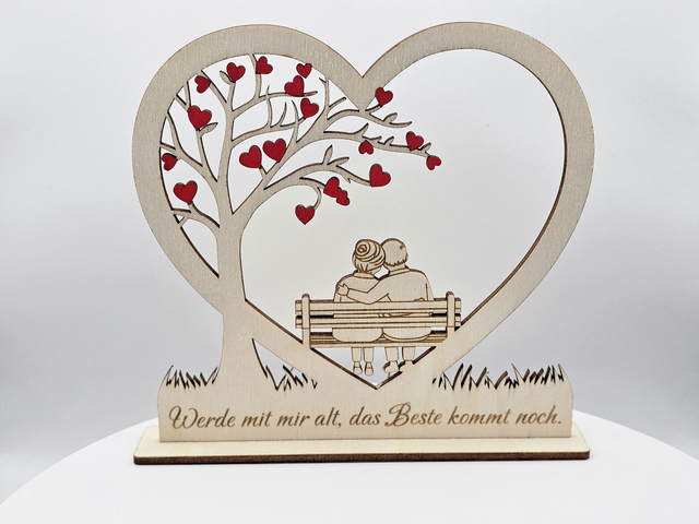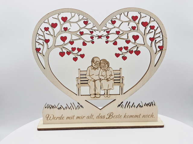 Diese liebevoll gefertigte Holzdekoration zeigt ein älteres Paar auf einer Bank, umgeben von einem herzförmigen Baum mit roten Herzen – ein starkes Symbol für wahre Liebe, Vertrauen und ein gemeinsames Leben.