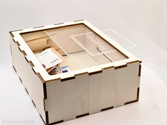 Praktische und dekorative Sparbox aus Holz mit transparentem Sichtfenster – perfekt zum Geldsammeln oder als originelles Geschenk.